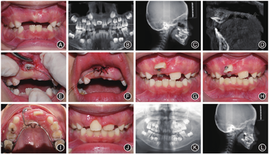 方移动;I:上颌改良Nance托;J:治疗后口内像;K:治疗后全颌曲面断层片;L:治疗后头颅侧位片