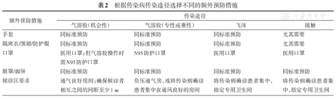 (5)根据传染病的传播特征和严重程度有针对性地加强医务人员的个人防护。表2总结自多个US CDC[7,14,16,30,31]、WHO[6,29]和NHMRC[15]的相关指南。