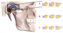 畸形)。TMD好发于青壮年,女性多见,以20 ~ 30岁患病率最高,发病率达28% ~ 88%。TMD分为功能紊乱病、结构紊乱病、炎性疾病和骨关节病四大类。临床上最常见的疾病类型往往与颞下颌关节盘相关,也就是结构紊乱。颞下颌关节盘根据其位置可分为正常、可复性关节盘前移位、不可复性关节盘前移位(图1)。TMD的"三大"主要症状是下颌运动异常、关节区疼痛、弹响与杂音等,此外还有"三小"症状,即部分患者伴有头痛、耳部症状(耳鸣)、心理疾病[1,2,3]。