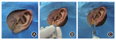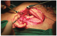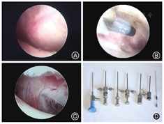 广州医科大学附属口腔医院颞下颌关节病科通过3万余例TMD患者临床诊疗经验,提出了"序列化、微创化、数字化、舒适化、人文化"的特色诊疗模式[4]。第一阶段为保守治疗,具体治疗方案是关节腔注射治疗(关节腔内注射透明质酸钠,图2)联合关节咬合板治疗,再辅以理疗、药物治疗和手法复位,有效率达85%左右,是TMD患者选择最多也是最佳的"一线"治疗方法。少数患者对于保守治疗效果不佳,如疼痛、绞锁、开口限制未得到改善,笔者团队会建议患者进行第二阶段治疗,即关节镜微创治疗(图3),这可进一步提供辅助诊断以及治疗作用。关节镜治疗可对病变关节进行灌洗、黏连松解、清除黏连物、骨组织修整以及关节盘复位,此法对于保守治疗无效的TMD患者有肯定的疗效。第三阶段为开放性手术(图4),因颞下颌关节盘前移位导致长时间疼痛和功能障碍,因外伤、关节盘前移位及骨关节病导致的关节盘穿孔,或颞下颌关节镜微创治疗疗效不佳并愿意接受此法的患者,施行颞下颌关节盘复位锚固术或关节盘穿孔修补术。本文重点阐述"序列梯度"治疗中"保守治疗"的一种临床治疗方法——"颞下颌关节咬合板"治疗。