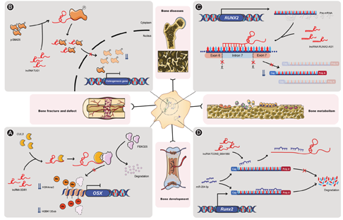 首先,对于调控机制的研究仍需进一步深入。不同的lncRNA因来源、剪接、修饰等的不同,其结构、定位、功能可能产生巨大差异,这提示lncRNA的作用机理可能远比想象中复杂。如果能从lncRNA在基因组的位置及其与毗邻基因的联系,或者从lncRNA的结构、修饰、亚细胞分布与功能的联系等角度思考其对基因信息传递的影响,可能更有助于进一步理解其中复杂的调控网络。同时也需要注意,成骨分化是精确而又具有很强时序性的过程,同一个lncRNA在不同时间段对成骨分化的影响可能不同,对其机制的研究有必要考虑时间这一重要维度。