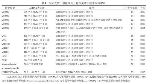 如前所述,由MSC向成骨谱系定向分化是一多时期、多阶段的动态过程。不同来源的MSC,成骨分化不同的时期与阶段间,基因的表达情况可能完全不同,作用的方式也可能存在差异。随着基因测序技术的不断发展,利用高通量测序配合生物信息学分析已成为大规模筛选与成骨分化相关lncRNA的重要手段。例如,Zhang等[19]利用高通量测序手段对正常及成骨诱导分化后的人骨髓间充质干细胞(human bone marrow-derived mesenchymal stem cell,hBMSC)进行基因测序,配合生物信息学手段对比两者之间表达存在明显差异基因,发现hBMSC成骨向分化后,有785个lncRNA表达显著升高,有623个显著下降。接下来其又进一步筛选出6个可能的关键lncRNA,并通过细胞学实验验证了其中的lncRNA XR_111050对hBMSC成骨分化的影响。又如,Yu等[20]通过类似方式筛选人脂肪间充质干细胞(human adipose tissue-derived mesenchymal stem cell,hASC)成骨诱导分化过程中差异性表达的lncRNA,最终明确了在hASC成骨分化中特异性高表达的lncRNA PCAT1,并进一步探究其可能的调控机制。本文试总结了近年来不同研究中与成骨分化相关的lncRNA表达谱,具体内容可参见表1。