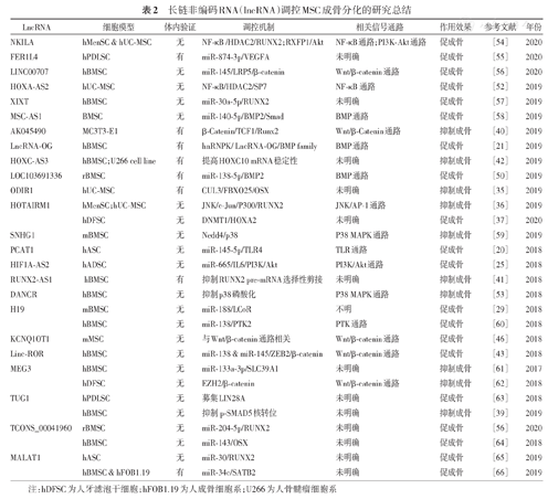 本文试从细胞模型、体内验证、调控机制、相关信号通路及作用效果几个方面对近年来lncRNA调控成骨向分化相关的研究做一总结,具体内容可参见表2。
