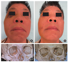 典型病例 患者,男,53岁,因高处坠落跌伤致昏迷0.5 h入院。主要查体:格拉斯哥昏迷指数(Glasgow coma scale,GCS)评分10分。CT示:右侧颧骨复合体、右侧颞骨粉碎性骨折,脑挫裂伤,颅底颅前窝颅中窝骨折。诊断:(1)中度脑外伤:脑挫裂伤、颅骨及前中颅底骨折;(2)右侧颧骨复合体骨折(图1A、1C)。治疗:入院后给予抗炎、止血、护脑等对症治疗后,患者生命体征平稳。伤后7 d颌面部消肿,有手术指证,经麻醉科会诊后行右侧颧骨复合体骨折切开复位内固定术(图1B、1D)。术后继续抗炎、护脑对症治疗并康复治疗,病情稳定出院。随访6个月,患者恢复满意,无口腔颌面部功能障碍。