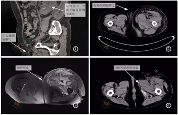 肾周脓肿是指发生在肾周间隙内的化脓性感染,多由肾脓肿或肾内感染穿破肾被膜所引发,包括肾源性和肾外源性两型,大多为肾源性。肾周脓肿患者起病隐匿,通常被检查发现时病情已很危重,故对其做到早期诊断和早期预防是至关重要的。研究发现,肾周脓肿多有以下诱发因素:泌尿系梗阻、尿路结石、糖尿病、免疫力低下、女性及既往泌尿系手术,并且一些患者可能同时存在多个诱发因素。本例患者病因为结石梗阻后继发感染,形成脓肾及肾周脓肿,结石刺激进而脓肿破溃形成肾瘘。脓液可随窦道的不同途径引流,向前可穿破腹腔,侵及消化道并与之形成瘘道,以肾结肠瘘为多见;向下扩展可形成髂窝脓肿;向上扩展可形成膈下脓肿或穿破,膈肌引起脓胸;脓液穿过珀蒂腰三角至皮肤引流,可引起皮肤瘘。大腿脓肿的病例亦十分少见,总的来说有三类致病因素:一类是单纯的软组织感染分为原发性和继发性;第二类是寄生虫性脓肿;第三类是股骨骨髓炎或股骨结核所致,临床表现几乎一致。患者多表现大腿红、肿、热、痛。本例患者左大腿脓肿致病因素属于继发性的单纯的软组织感染,由于腹膜后间隙是一个潜在的间隙,肾周脓肿破溃形成肾瘘,脓液的活动空间很大,向下扩展沿腰大肌、髂腰肌注入髋部及大腿后外侧,故而形成大腿脓肿[1]。