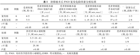 比较复发组和未复发组受者性别、原发病发病年龄、进展至ESRD时间、透析时间、供肾类型、手术时年龄、HLA错配数、是否进行免疫诱导、是否预防性使用利妥昔单抗、供者年龄和性别等一般资料。观察复发组受者使用血浆置换联合大剂量环孢素对移植肾FSGS复发的治疗效果。