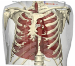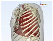 手术当日在患者体表骨性标记点处放置电极片作为影像匹配用标记点。嘱患者平卧位双侧手臂置于身体两侧,行胸部CT平扫检查。利用该CT所得影像学资料,术前对患者胸壁皮肤及体表标记、肋骨、肿瘤和肺组织进行三维重建。通过术前胸部CT可知,肿瘤平对左侧第3肋骨上缘,因此在三维重建模型中添加由肿瘤向体表垂直方向的辅助线,通过第3肋骨上缘,长度与拟使用的穿刺定位hookwire定位针等长(全长10.7 cm)。