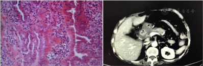 手术时间280 min,术中出血量50 ml,未予输血。术后病理报告:胰头慢性炎;胰管扩张,胰管内见增生性息肉(图10)。术后有胆漏,量100~200 ml/d;术后2周带管出院。无术后出血、胰瘘、十二指肠瘘、胆总管狭窄等并发症。术后2个月复查CT,结果满意(图11)。
