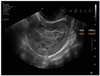 注:右后壁肌壁间突向浆膜下查见5.9 cm×3.4 cm×5.0 cm的弱回声,边界清楚