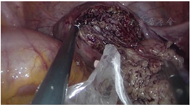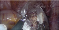 诊治经过:综合病史、体格检查及辅助检查。术前诊断:子宫肌瘤、宫内膜息肉待诊;遂于2020年2月24日行宫腔镜检查及TU-LESS子宫肌瘤挖除术。宫腔镜术中见:两侧宫角及子宫后壁均可见息肉样突起,直径约1 cm,术中冰冻病理结果提示子宫内膜呈增生期组织像。腹腔镜下见子宫增大如孕2个月大小,后壁肌壁间突向浆膜下可见一直径约5 cm×5 cm×6 cm的肌瘤样突起,实性、质软,切面呈灰黄色、未见明显旋涡状结构,与子宫肌壁界限欠清,考虑恶性不能排除,术中及时将标本袋置于瘤体周围继续挖除,以减少病灶在盆腹腔内的播散(图2)。全部标本装袋后于脐部切口经冷刀旋切取出(图3)。术中冰冻病理结果显示高度怀疑子宫内膜间质肉瘤(endometrial stromal sarcoma,ESS)(低级别),待冻后石蜡病理结果确定。术中与患者家属沟通,鉴于患者年轻,且术中冰冻病理与术后石蜡病理结果可能存在不一致,选择暂不扩大手术范围,等待术后石蜡病理结果。