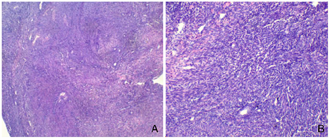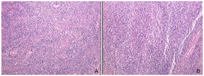 注:A.HE×40;B.HE×100;富于梭形细胞和血管,见多区域为密集的似子宫内膜间质的螺旋小动脉