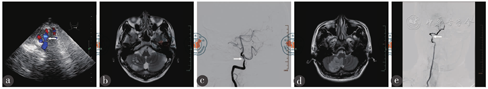病例1 患者,男,31岁,因头痛、头晕1 d而收住入院。患者于2019年1月16日躺在沙发上玩手机2个多小时后,起身时突感头晕,伴视物旋转、行走不稳、后颈部疼痛,无恶心、呕吐,无黑朦,无复视,无耳鸣及听力下降,约1~2 min后自行好转,遂至当地医院就诊,查头颅CT未见明显异常,就诊过程中再次发生头痛、头晕,伴恶心、呕吐胃内容物4次,予甲磺酸倍他司汀片、异丙嗪等治疗,头痛、头晕无明显改善。为求进一步治疗,来我院就诊,经颅彩色多普勒超声(transcranial color Doppler ultrasound,TCCD)(2019年1月17日)示右椎动脉段V4段探及双管腔结构(图1a),夹层考虑。头颅磁共振成像(magnetic resonance imaging,MRI)(2019年1月17日)示右侧小脑半球多发性脑梗塞(图1b),拟"小脑梗塞、椎动脉夹层"收住。患者既往体健。入院查体:体温37.3 ℃,脉搏74次/min,呼吸21次/min,血压120/79 mmHg(1 mmHg = 0.133 kPa),青年男性,身高170 cm,体质量58 kg,发育正常,营养良好,睡眠胃纳可,大小便无殊,心、肺、腹部查体未见异常,诉后颈部有胀痛,用数字评定量表法(用0~10分代表不同程度的疼痛:0分为无痛,1~3分为轻度疼痛,4~6分为中度疼痛,7~9分为重度疼痛,10分为剧痛)自评疼痛分值为2分;神经系统查体:行走不稳,美国国立卫生研究院卒中量表(National Institute of Health stroke scale,NIHSS)评分1分;辅助检查:血常规、凝血、红细胞沉降率、血同型半胱氨酸、抗中性粒细胞胞浆抗体、抗核抗体、抗心磷脂抗体、病毒标志物、传染病、风湿系列等指标均未见明显异常;数字减影血管造影(digital subtraction angiography,DSA)(2019年1月18日)示右侧椎动脉V4段重度狭窄(71%),长度约18 mm(图1c),动脉夹层首先考虑;入科后给予皮下注射4 100 U低分子肝素,每12小时注射1次,5 d后头痛、头晕症状消失,7 d后停用抗凝药物,给予硫酸氢氯吡格雷片75 mg(1次/d)、拜阿司匹林100 mg口服(1次/d),12 d后出院。1个月后面对面随访,无任何不适现象,查体无殊。