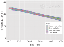 | 类型 | 年 | 实际观测值 | ARIMA(95%CI) | 回归预测(95%CI) | 灰色预测 |