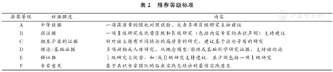 | A | 中等证据 | 一项高质量的随机对照试验,或者多项Ⅱ级研究支持建议 |