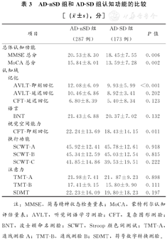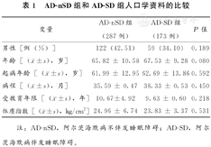 | 项目 | AD-nSD组(287例) | AD-SD组(173例) | P值 |