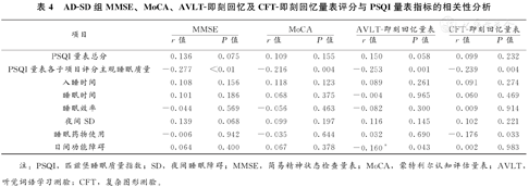 AD-SD组MMSE、MoCA、AVLT-即刻回忆及CFT-即刻回忆量表评分与PSQI量表指标的相关性分析