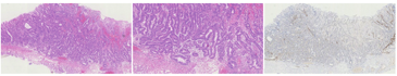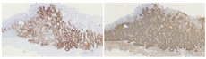 HE染色可见病变浅层有小凹上皮分布,深层可见不规则的、相互融合的腺体,且病变向深层延伸,突破黏膜肌层向下生长(图5)。17例病例完成了免疫组织化学染色,分别染色了代表分化为颈黏液细胞的Mucin-6、评估黏膜肌层侵犯的Desmin以及判断具体分型的Pepsinogen、H/K-ATPase(图6),部分病例还评估了增殖指数Ki-67及P53突变(图7)。
