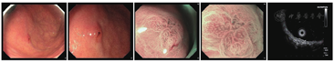 综合以上GA-FG内镜下表现,我们选取了第20号病例作为典型病例展示其白光内镜、ME及超声内镜结果(图4),并在后文继续展示内镜下治疗及术后病理。