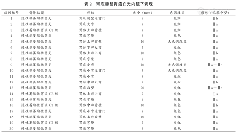 | 病例编号 | 背景黏膜 | 部位 | 大小(mm) | 色调改变 | 形态(巴黎分型) |