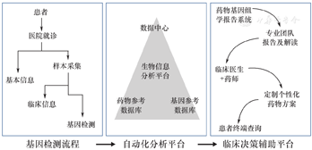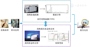 此外,治疗药物监测(therapeutic drug monitoring,TDM)可根据患者的具体情况,以药物代谢动力学和药效学基础理论为指导,借助先进的分析技术与电子计算机手段,利用药物代谢动力学原理和公式,辅助临床医生给患者提供个体化治疗方案,从而达到提升治疗疗效、规避毒副反应的目的。联合药物浓度监测与药物相关基因多态性分析,有助于提高精准医学的诊疗效率,减少患者费用,缩短试药过程。TDM联合药物基因多态性分析流程见图2。