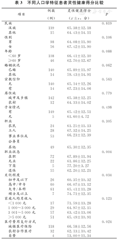 不同人口学特征患者灵性健康得分比较