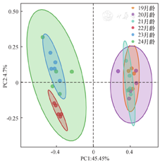 β多样性通过分析各样本间的物种组成成分和丰度信息来反映样本间的关系,如图3所示,图中PC1能解释样本差异数据的45.46%,PC2能解释样本差异数据的4.7%,不同颜色的散点代表不同月龄大鼠的肠道菌群,菌群结构相近的样本有聚在一起的倾向,直观清晰地反映不同月龄大鼠间的肠道菌群差异。19~21月龄大鼠肠道菌群结构相似,22~24月龄大鼠肠道菌群结构相似。月龄越大,相同月龄大鼠组内各样本间越分散,反之越集中。