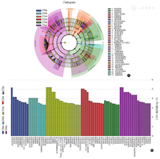 注:A,不同月龄大鼠肠道菌群LEfSe多级物种层级树状图;B,不同月龄大鼠肠道菌群标志物种的LDA效应值柱状图;LDA,线性判别分析。