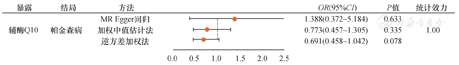 综上,从基因层面而言,血清CoQ10水平与AD及PD无明显因果关联。利用其作为预测AD、PD的生物标志物可能效果不佳。未来仍需开展规范化、大样本的临床试验及相关MR研究,深入探讨CoQ10在大脑局部的代谢水平和其氧化还原状态改变对AD、PD的预防及治疗的潜在效果和临床意义。