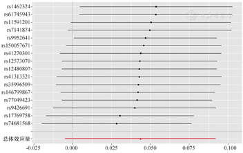 敏感性方面,本研究通过IVW及MR-Egger回归分别计算Cochran's Q统计量,若P>0.05则代表没有明显异质性。同时,我们还通过留一法逐个剔除纳入SNP,观察是否对分析结果产生影响,并绘制森林图,若剔除某个SNP后,得到P>0.05则认为SNP不会对结果造成显著影响[17]。多效性方面,我们同时采用MR-Egger回归的截距项及孟德尔随机多效性残差和及异常值(Mendelian randomization pleiotropy residual sum and outlier,MR-PRESSO)检验纳入SNP的水平多效性。在MR-Egger回归中,若截距趋于0,则可认为不存在水平多效性。在MR-PRESSO检验中,不仅可以计算出所纳入工具变量的水平程度,还可将异常值剔除后计算暴露与结局间的效应量,并对校正前后的结果进行检验[20]。