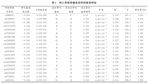 | 单核苷酸多态性 | 等位基因效应值 | β的标准误 | 效应等位基因 | 非效应等位基因 | 效应等位基因频率 | P值 | R2 | F | 样本量(例) |