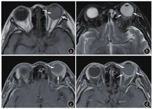 注:患者肺癌术后化疗后3年,视力下降2周。图a为平扫T1加权像(T1WI),图b为T2加权像(T2WI),图c、d为T1加权增强图像。见左侧眼球后极部新月形病灶,T1WI呈等信号,T2WI呈稍高信号,增强扫描明显强化(箭),左侧眼球玻璃体混浊伴出血(图c,d弯箭),结合病史考虑脉络膜转移。