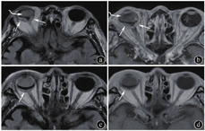 注:患者肺癌术后化疗后4年,视力下降1周,视网膜脱离术后。图a为平扫液体衰减反转恢复(FLAIR)序列,图b为增强扫描T1加权像(T1WI)。见右侧眼球后极偏侧两个梭形病灶,FLAIR呈稍高信号,增强扫描中等均匀强化(直箭),另可见继发右侧晶状体混浊(弯箭)。图c、d分别为化疗+局部放疗后FLAIR序列及增强扫描T1WI,见病灶有缩小,但仍可见肿瘤残存(直箭)。