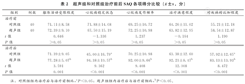 超声组和对照组治疗前后SAQ各项得分比较(