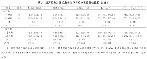 入组的研究对象治疗前HRV指标SDNN、rMSSD、PNN50、LF、HF组间比较差异均无统计学意义(P>0.05)。比较两组治疗后各项HRV指标的变化,研究结果显示治疗后超声组SDNN、rMSSD、PNN50、LF、HF均高于治疗前,前述变化均显著优于对照组,对照组治疗后PNN50及HF均较前升高,差异均有统计学意义(P<0.05),对照组治疗后SDNN、rMSSD、LF较治疗前差异无统计学意义(P>0.05),见表3。