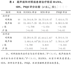 入组的研究对象治疗前组间HAMA、SDS、PSQI得分比较差异均无统计学意义(P>0.05)。治疗后超声组HAMA、SDS、PSQI得分均较治疗前显著减少,其中HAMA评分改善程度显著优于对照组,差异有统计学意义(P<0.05),见表4。