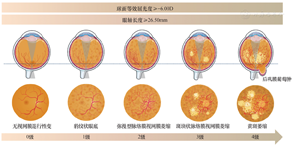 注:PM在高度近视的基础上产生的眼底病变包括近视弧形斑、漆裂纹、黄斑出血、后巩膜葡萄肿等。MMD分为五级,0级(无视网膜退行性病变);1级(豹纹状眼底);2级(弥漫性脉络膜视网膜萎缩);3级(斑块状脉络膜视网膜萎缩);4级(黄斑萎缩以及另外3个附加病变,即漆裂纹、脉络膜新生血管和Fuchs斑)。在此标准中,2级以上或具有至少1个附加病变即可诊断为PM。PM,病理性近视;MMD,病理性近视性黄斑变性。图1修改自Servier Medical Art(http://smart.servier.com/)。