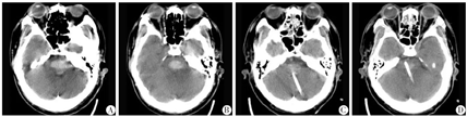 A~B:术前CT提示脑干内血肿;C~D:术后CT提示引流管位置良好,血肿大部分清除