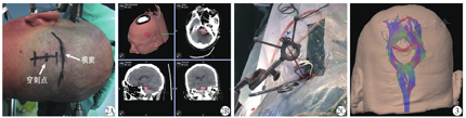 男性,50岁,主因"突发意识不清6 h"于2017年6月29日收治于解放军总医院第七医学中心神经外科。既往有高血压病史10年,未规律监测血压及服药控制。体检:血压200/100 mmHg(1 mmHg=0.133 kPa),神志深昏迷,GCS评分5分,双侧瞳孔圆形,直径约2 mm,对光反射迟钝,四肢肌力Ⅱ级,双侧巴氏征阳性。辅助检查:头颅CT示桥脑出血,出血量约8 mL(图1A~B)。初步诊断:脑干出血;高血压病3级,极高危组。入院后予以降压、止血等治疗,发病后15 h行无框架导航系统辅助下脑干血肿穿刺置管引流术。全身麻醉下,先仰卧位行气管切开术,然后右侧卧位,注册导航,穿刺点位于左侧横窦下2 cm,乙状窦和中线之间(图2A),根据导航指示设计穿刺路径(图2B~C)。术中切开头皮、皮下及肌肉层,颅骨钻孔,切开硬膜,调整无框架导航臂,置入带枕芯引流管,深度距小脑皮层约6 cm,拔出针芯,转动引流管同时以5 mL注射器缓慢轻抽出血肿约5 mL,缝合肌肉、皮下及头皮,固定引流管,术毕。术后2 d复查头颅CT提示引流管位置良好,血肿清除满意(图1C~D);头颅核磁DTI重建显示主要的神经纤维束得以保留(图3),拔除引流管。术后5 d患者清醒,恢复过程顺利,并发肺部感染,经抗感染治疗后好转,无消化道出血、中枢性高热等并发症,住院时间23 d,出院后行康复治疗。随访5个月,GOS评分4分。