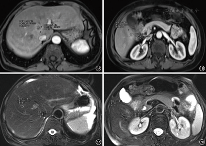 患者44岁女性,以"体检发现乙状结肠肿块3月"为主诉入院,查体未见明显异常。肠镜示:距肛20 cm结肠新生肿物,结肠多发息肉,病检:腺癌。腹部增强CT提示:乙状结肠肠壁增厚,浆膜面毛糙,动脉期强化明显,局部见多发肿大淋巴结,腹中动脉可见一枚短径5.8 mm淋巴结(见图3A)显示,肝右后叶肿块影。胸部平扫CT未见异常。上腹部增强MRI提示肝右后上段见大小约3.9 cm×2.5 cm肿块影(见图4A),动脉期不均匀明显强化。AFP:1.51 ng/ml(正常<8 ng/ml),CEA:84.77 ng/ml(正常<3.4 ng/ml)。初步诊断:乙状结肠癌伴肝、腹主动脉旁淋巴结转移(cT4aN2M1b,IV期)