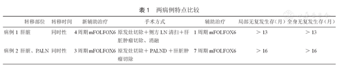 后续患者追加7周期mFOLFOX6方案化疗。随访16个月未见局部复发及远处转移,肝脏亦未发现新发病灶。两病例特点见表1。