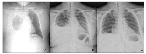 注:IPD:间断性腹膜透析;A:治疗前,大量胸腔积液;B:IPD治疗1个月后,胸腔积液明显较少;C:IPD治疗6个月后,胸腔积液完全消失