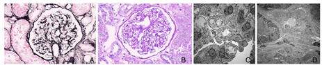 注:A:PASM染色400×;B:PAS染色400×;C、D电镜:40 000×