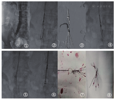 入院后第5天,行下腔静脉可回收滤器取出术。经双侧足背静脉留置针造影示:双下肢静脉未见充盈缺损。Seldinger法穿刺右股静脉成功后送入4F短鞘,经鞘造影示下腔静脉通常,滤器贴壁(图1),泥鳅导丝配合4F多功能导管选入下腔静脉,交换入260 cm超硬泥鳅导丝于滤器上方,纠正滤器倾斜贴壁。Seldinger法穿刺右颈静脉成功后,置入5F短鞘,泥鳅导丝配合4F多功能导管选入下腔静脉远端,交换260 cm超硬泥鳅导丝,沿导丝送入9F短鞘扩张右颈静脉穿刺点,后沿导丝送入BARD圈套器取回套组于下腔静脉滤器上方。抓捕器反复尝试抓捕滤器上方小钩未成功,但与断裂滤器细丝缠绕(图2,图3,图4),无法收回抓捕器。退出9F取回鞘,260 cm超硬导丝配合切除部分头端的Pigtail导管沿11F导引鞘软管送入,到达滤器下方,继续沿导引鞘送入Atrieve抓捕器于下腔静脉滤器上方,成功抓捕260 cm超硬泥鳅导丝软头,退出Pigtail导管后,将导丝拔出体外。收紧260 cm泥鳅导丝双侧头纠正滤器倾斜贴壁,经导引鞘送入Atrieve抓捕器,成功抓获滤器上方小钩。沿三条导丝送入取回鞘,收紧导丝,将滤器收入鞘内,拔除体外,见滤器完整,断裂部分与BARD抓捕器紧密缠绕(图5,图6,图7,图8)。重复造影示:下腔静脉显影良好,未见对比剂外溢。术后复查腹部CT未见下腔静脉异常。
