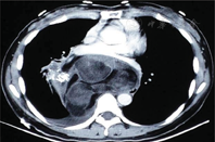 纵隔脂肪肉瘤仅占纵隔肿瘤的0.13%~0.75%[1]。复习相关文献,发现大多数为个案报道,多见于中老年人,女性少于男性。临床症状缺乏特异性,与肿瘤生长的部位、大小以及对邻近组织的压迫程度有关。可因肿瘤累及气管、食管、血管、神经、心包等重要脏器,患者出现咳嗽、胸闷胸痛、气喘气促、吞咽困难等不适症状。上腔静脉阻塞综合征可发生于肿瘤压迫上腔静脉者。少数患者于体检时偶然发现,本例为体检发现。脂肪肉瘤的病因未完全明确,有学者认为与外伤以及病毒感染可能有关。目前,多数研究结果提示脂肪肉瘤的组织来源是纵隔内间叶组织中脂肪成分发生的恶性肿瘤[2,3]。纵隔脂肪肉瘤的病理类型包括高分化型、黏液型、去分化型、多形性、圆细胞型和混合型[4]。其中比例最高的是高分化脂肪肉瘤,约占40%~45%;其次是黏液样脂肪肉瘤和多形性脂肪肉瘤,混合型脂肪肉瘤非常罕见[5]。也有文献提出黏液型最常见,约占总数的50%[6]。