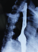 女性,45岁,因"体检发现后纵隔占位6 d"于2015年4月13日入院。查体无明显异常。实验室及器械检查显示:胸部CT显示右后纵隔内可见一较大不规则形异常密度影,最大横断面范围约160 mm×103 mm,内部密度混杂多样,可见多发脂肪成分及钙化灶,见多发分隔及多囊性病灶。增强后病变部分可见强化,部分未见强化,纵隔内心脏、血管、支气管及食管可见明显受压推移改变;纵隔、肺门未见肿大淋巴结影,右侧胸腔可见积液,胸膜未见增厚,考虑畸胎瘤(图1)。心电图示窦性心律,正常心电图。上消化道造影示食管中下段被纵隔右后方块状物推移至左侧;食管黏膜光整,形态规则,蠕动正常(图2)。肺功能检查显示:用力肺活量(forced vital capacity,FVC)为2.21 L,占预计值的77.2%;第1秒用力肺活量(forced vital capacity in the first second,FEV1)为1.79 L,占预计值的74.8%;最大通气量(maximum ventilatory volume,MVV)为86.52 L/min,占预计值的103.2%;FEV1/ FVC%为80.8%,提示肺功能轻度损害,混合性肺通气功能障碍。心脏彩超显示:心脏结构及功能未见明显异常。血常规、肝肾功能、凝血功能、血液传播疾病检查示基本正常。2015年4月20日,患者在双腔气管插管下行静脉复合麻醉,采用右胸后外切口从第6肋上缘进胸,术中见心脏后方巨大囊实性纵隔肿瘤,约18 cm×17 cm×10 cm,占据右后半胸腔。右下肺受压,部分粘连。肿瘤与主动脉、左下肺、右下肺、左右主支气管、食管、膈神经关系紧密,与两侧下肺均有粘连。手术切除完整的具有包膜多结节状肿物(图3)。切面灰白实性,呈鱼肉状,质地中等,界限清。病理诊断:高分化型脂肪肉瘤(图4)。患者病情恢复良好,术后第14天出院。