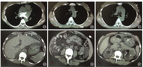 尿毒症透析患者,一般都存在高磷血症,应控制食物中磷的摄入,尽早使用磷结合剂及增加透析次数。治疗腹膜钙化的方法有停止腹膜透析改血液透析及泼尼松和他莫昔芬药物治疗。如果保守治疗效果不明显,可考虑手术治疗。2013年《慢性肾脏病矿物质与骨异常诊治指导》[19],建议当出现下列情况,可行甲状旁腺切除术:①iPTH持续大于800 pg/ml;②药物治疗无效的持续性高钙和/或高磷血症;③具备至少一枚甲状旁腺增大的影像学证据,如高频彩色超声显示甲状旁腺增大,直径大于1 cm并且有丰富的血流;④以往对活性维生素D及其类似药物治疗抵抗。本病例iPTH为1279.00 pg/ml,高于指南800 pg/ml的标准;血磷2.47 mmol/L;超声显示两枚甲状旁腺增大,直径均大于1 cm;合并有多发性转移性钙化,满足外科甲状旁腺切除术指针。本病例还需要长期随访二尖瓣受累情况及有无狭窄,左房团块状钙化变化,必要时外科切除钙化。