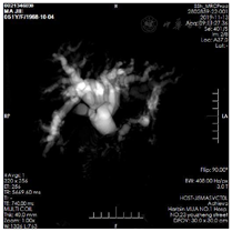 磁共振胰胆管水成像(MRCP):1.考虑胰腺钩突部占位继发肝内胆管、左右肝管、肝总管、胆总管中上段明显扩张,胆总管末端显示欠佳及胰管扩张。2.胆囊炎伴胆汁淤积(图2)。