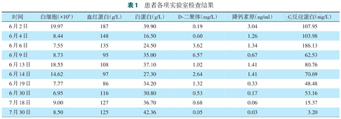 | 时间 | 白细胞(×109) | 血红蛋白(g/L) | 白蛋白(g/L) | D-二聚体(mg/L) | 降钙素原(ng/ml) | C反应蛋白(mg/L) |