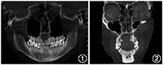 患者,女性,36岁,因"上颌前牙区反复肿胀1年余"入院,口服抗炎药物(具体不详)治疗,肿胀无明显消退,入院前1个月拍片发现上颌骨肿物收住院。患者既往健康,否认高血压、糖尿病病史,否认外伤手术史,家族中无类似病史。