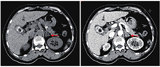 超声心动图:左房扩大(前后径43 mm),左室壁增厚(13 mm),左室舒张功能减低。双肾及肾血管超声:左肾内动脉血流阻力指数0.77(增高),余正常。肾上腺平扫增强CT:左侧肾上腺增粗,局部结节样,增强扫描边缘可见强化,径约1.4 cm,腺瘤?(图1)。